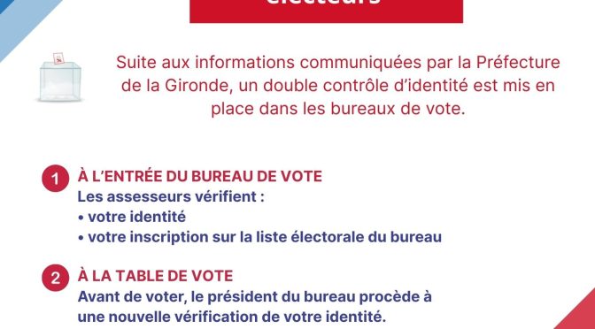 Suite aux informations communiquées par la Préfecture de la Gironde, un dispositif de double contrôle d’identité des électeurs sera mis en place dans les bureaux de vote de la commune.